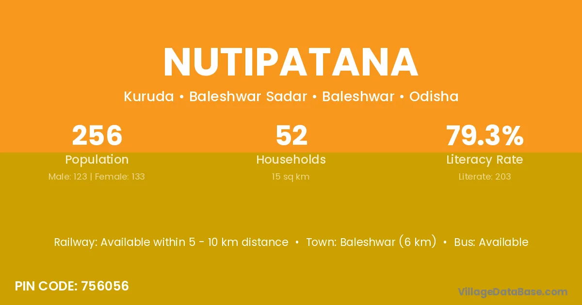 Baleshwar (6 km) is the nearest town to Nutipatana village for major economic activities and is located approximately 6 km away.
