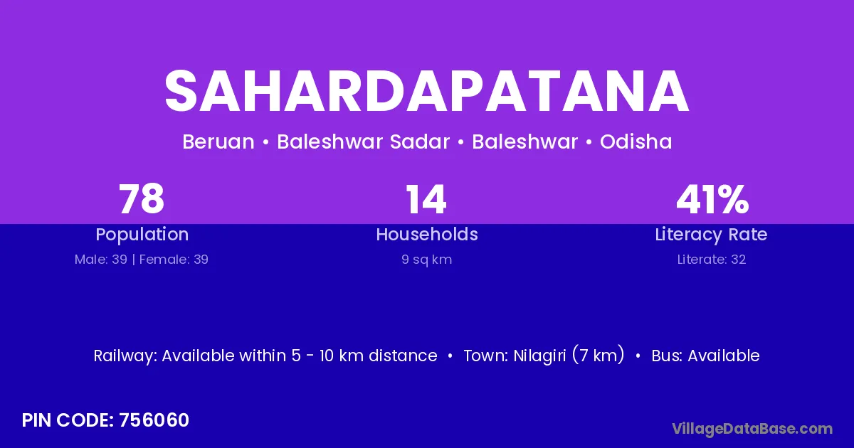 Sahardapatana village has a total population of 78 people, of which 39 are males and 39 are females.