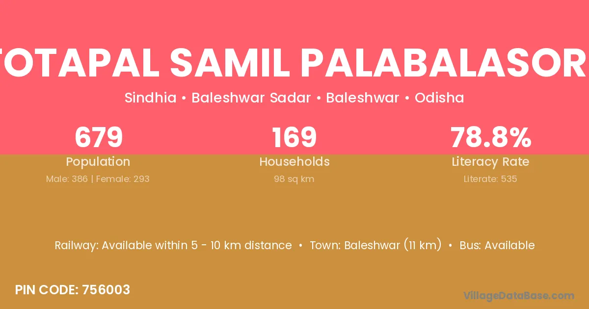 Totapal Samil Palabalasore village has a total population of 679 people, of which 386 are males and 293 are females.