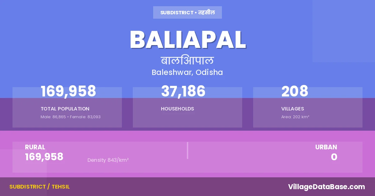 According to the 2011 census The total area of Baliapal Tehsil is 202 km², with a population of 169958 people. The population density is 843 inhabitants per square kilometre, and there are approximately 37186 houses in the sub district.