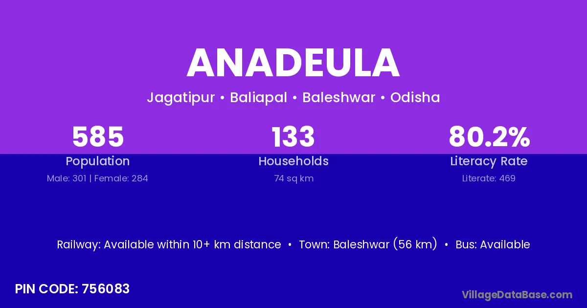 Baleshwar (56 km) is the nearest town to Anadeula village for major economic activities and is located approximately 56 km away.