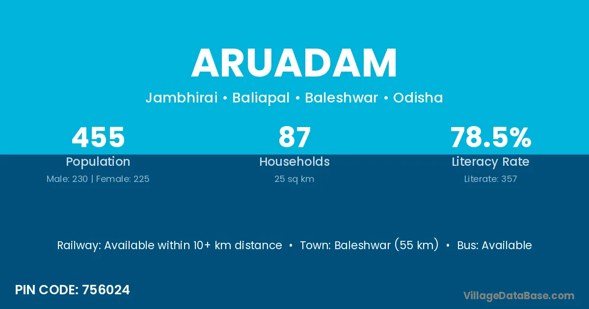 Baleshwar (55 km) is the nearest town to Aruadam village for major economic activities and is located approximately 55 km away.