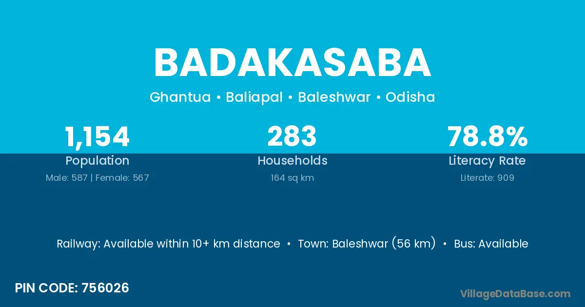 Baleshwar (56 km) is the nearest town to Badakasaba village for major economic activities and is located approximately 56 km away.