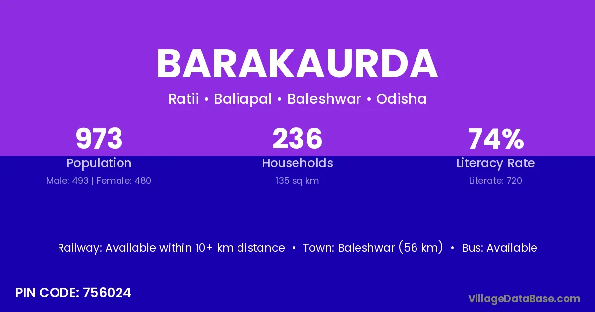 Baleshwar (56 km) is the nearest town to Barakaurda village for major economic activities and is located approximately 56 km away.