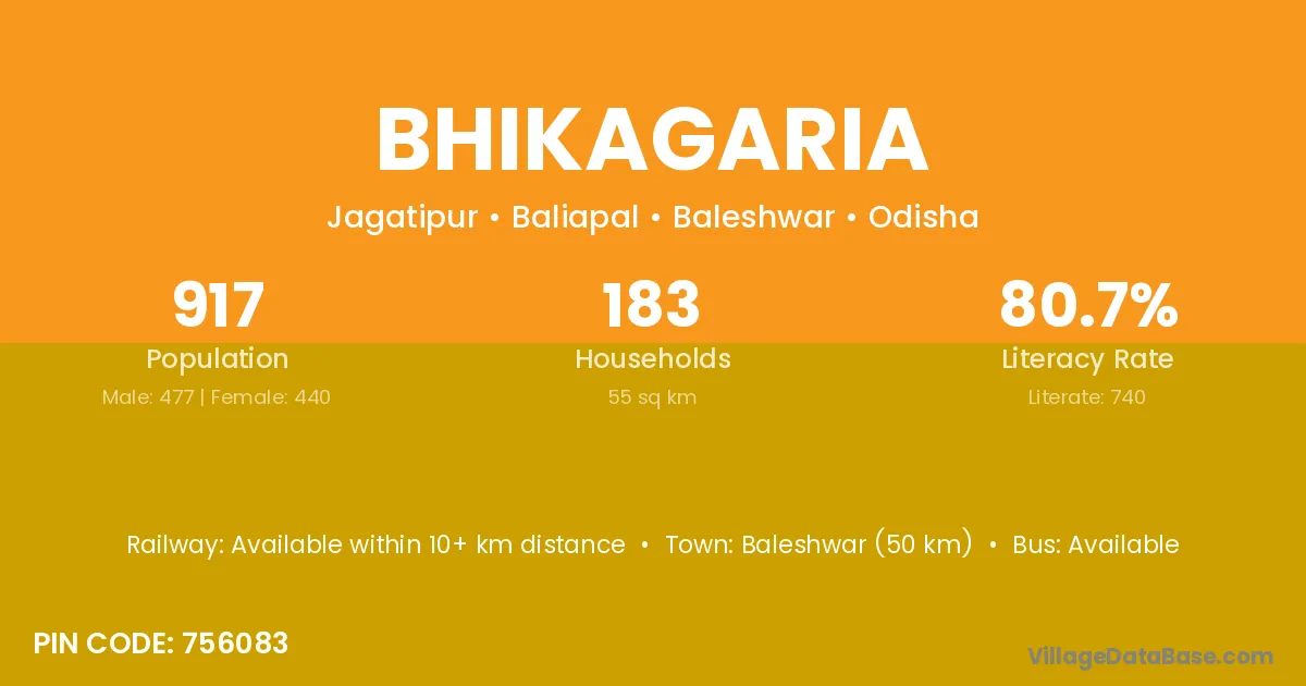 Baleshwar (50 km) is the nearest town to Bhikagaria village for major economic activities and is located approximately 50 km away.