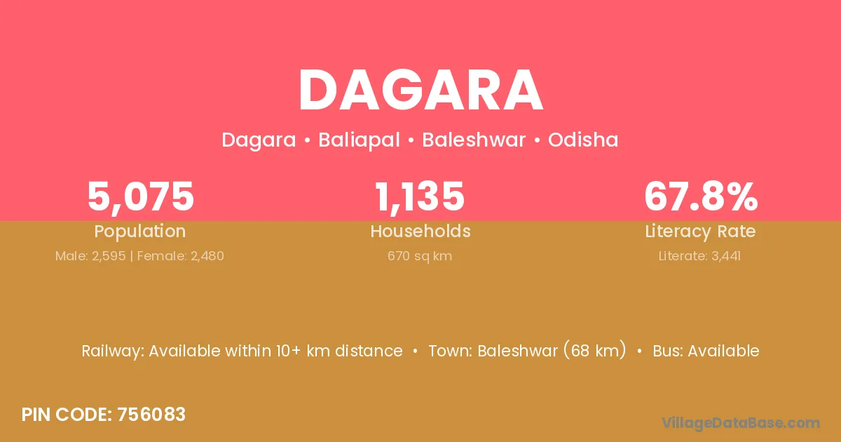 Baleshwar (68 km) is the nearest town to Dagara village for major economic activities and is located approximately 68 km away.