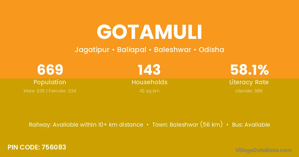 Baleshwar (56 km) is the nearest town to Gotamuli village for major economic activities and is located approximately 56 km away.