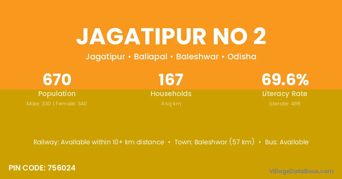 Jagatipur No 2 village has a total population of 670 people, of which 330 are males and 340 are females.