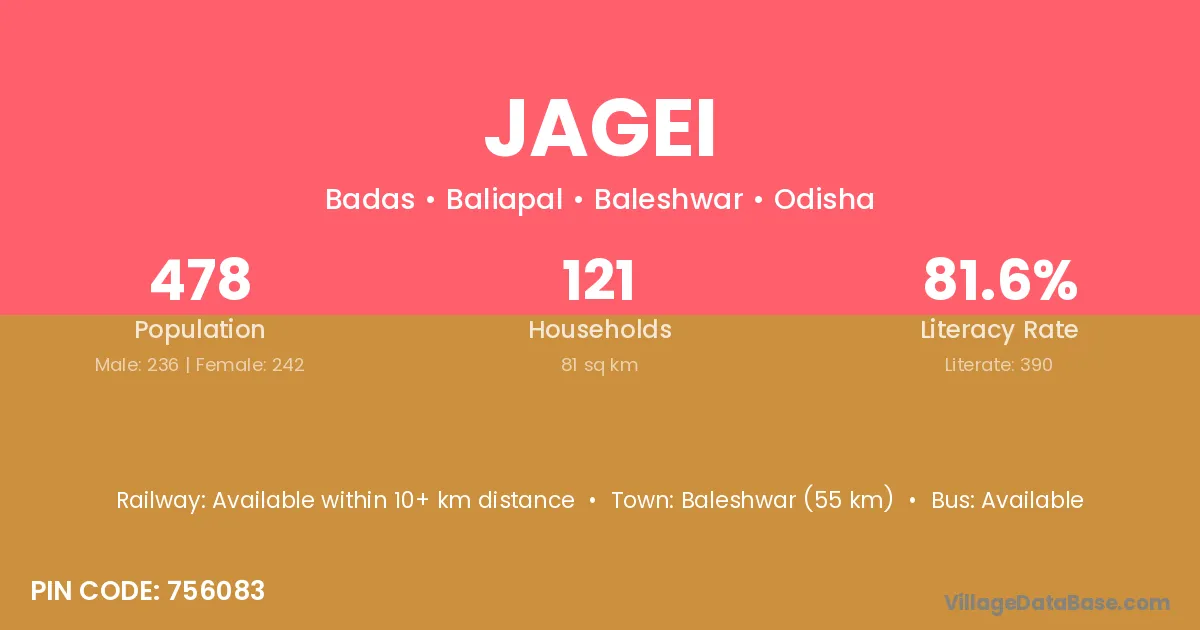 Baleshwar (55 km) is the nearest town to Jagei village for major economic activities and is located approximately 55 km away.