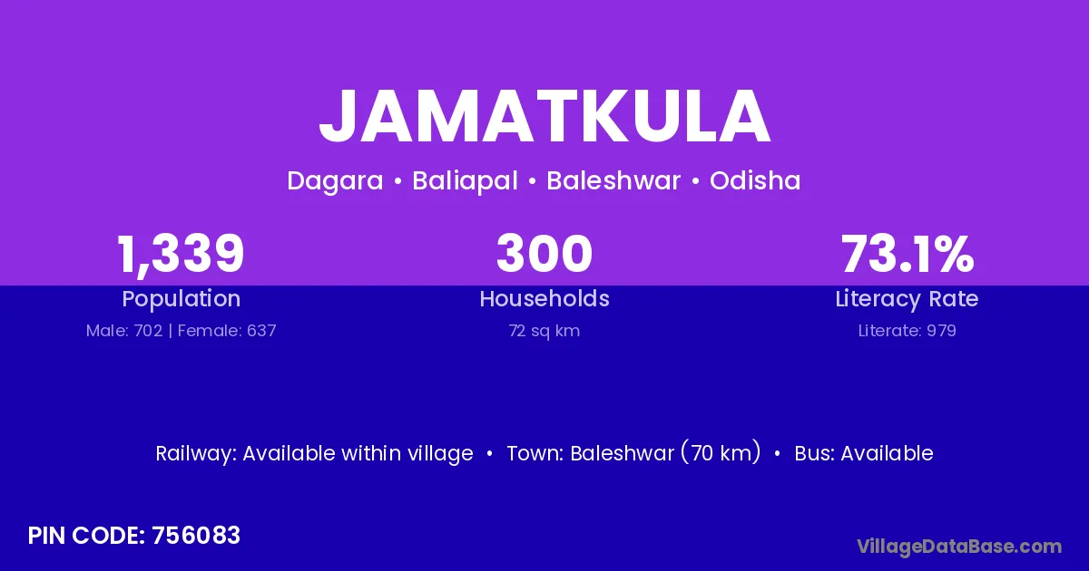 Baleshwar (70 km) is the nearest town to Jamatkula village for major economic activities and is located approximately 70 km away.