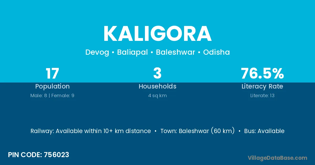 Baleshwar (60 km) is the nearest town to Kaligora village for major economic activities and is located approximately 60 km away.