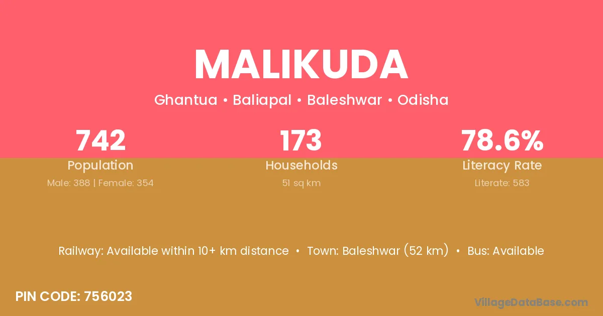 Baleshwar (52 km) is the nearest town to Malikuda village for major economic activities and is located approximately 52 km away.