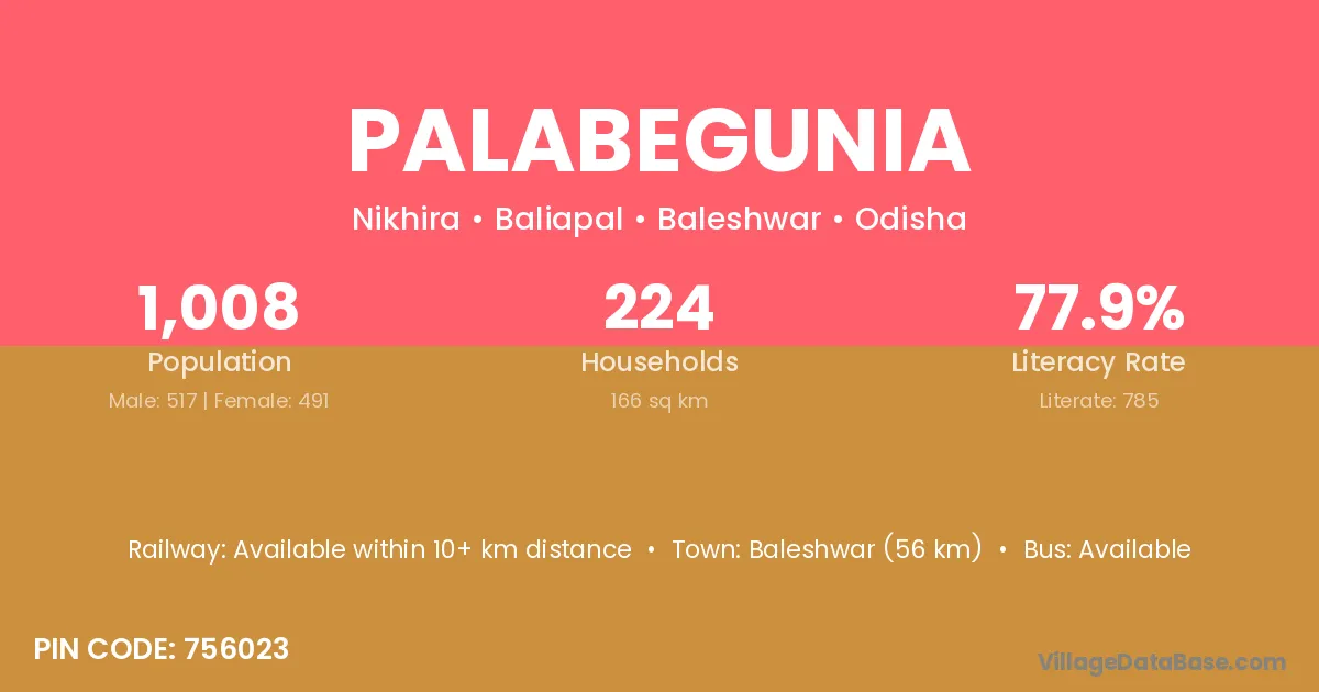 Baleshwar (56 km) is the nearest town to Palabegunia village for major economic activities and is located approximately 56 km away.