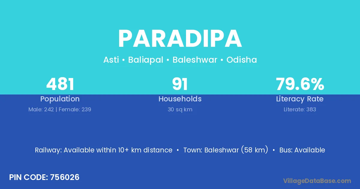 Baleshwar (58 km) is the nearest town to Paradipa village for major economic activities and is located approximately 58 km away.