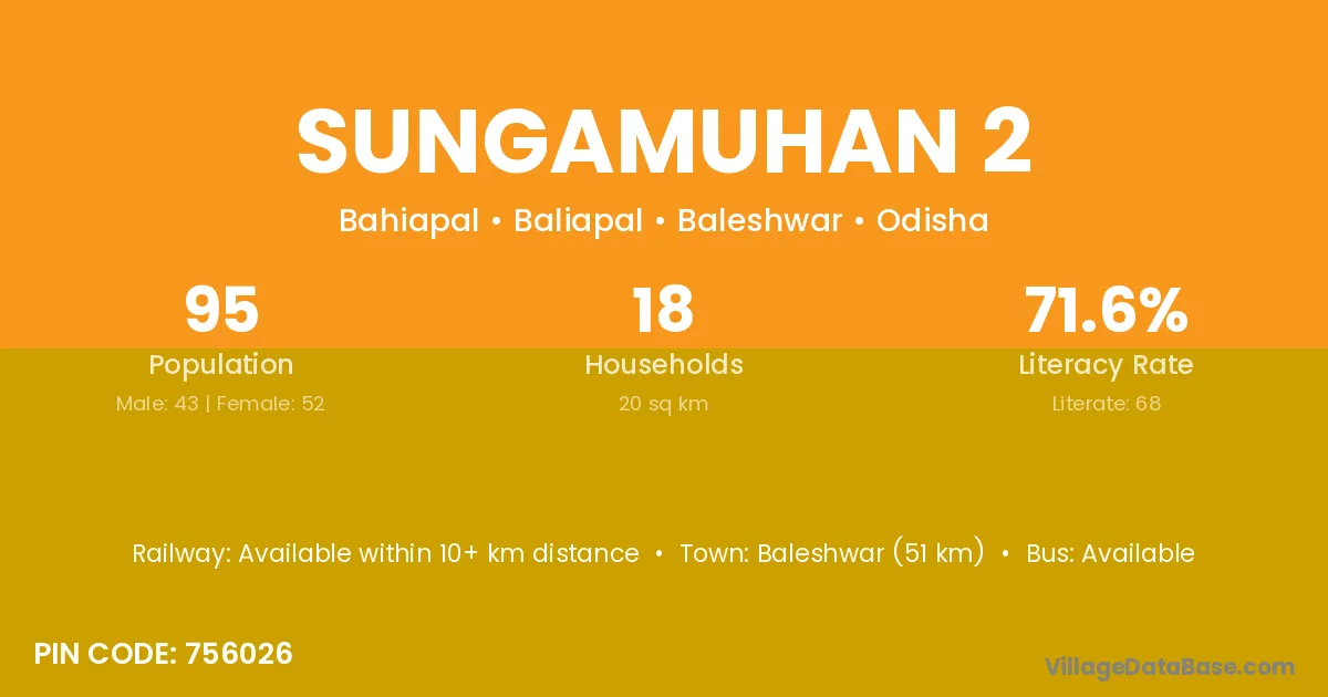 Baleshwar (51 km) is the nearest town to Sungamuhan 2 village for major economic activities and is located approximately 51 km away.