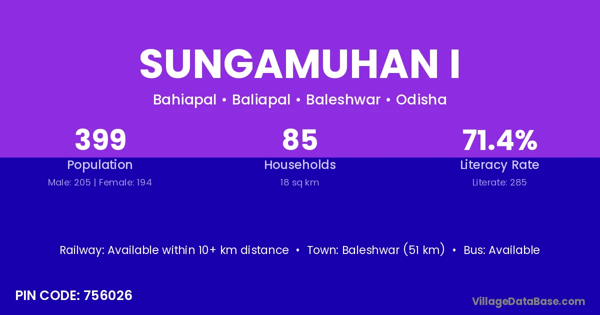 Baleshwar (51 km) is the nearest town to Sungamuhan I village for major economic activities and is located approximately 51 km away.