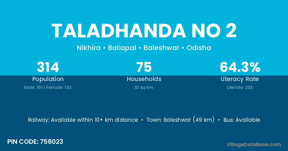 Taladhanda No 2 village has a total population of 314 people, of which 161 are males and 153 are females.