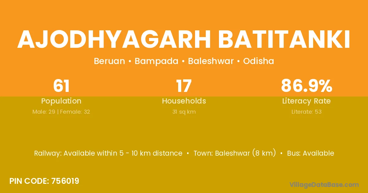 Ajodhyagarh Batitanki village has a total population of 61 people, of which 29 are males and 32 are females.