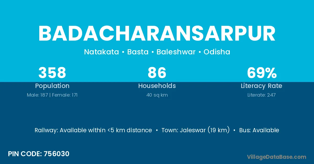 Badacharansarpur village has a total population of 358 people, of which 187 are males and 171 are females.