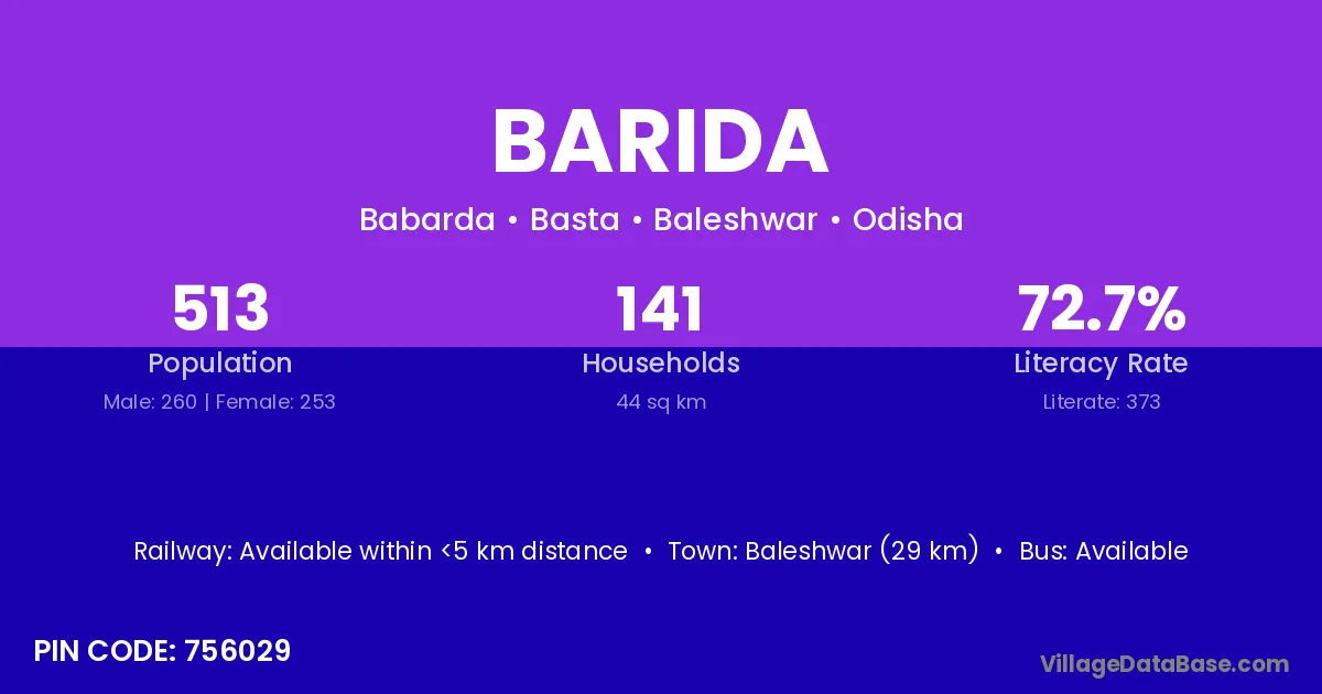 Baleshwar (29 km) is the nearest town to Barida village for major economic activities and is located approximately 29 km away.