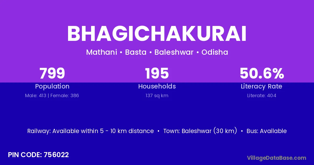 Baleshwar (30 km) is the nearest town to Bhagichakurai village for major economic activities and is located approximately 30 km away.