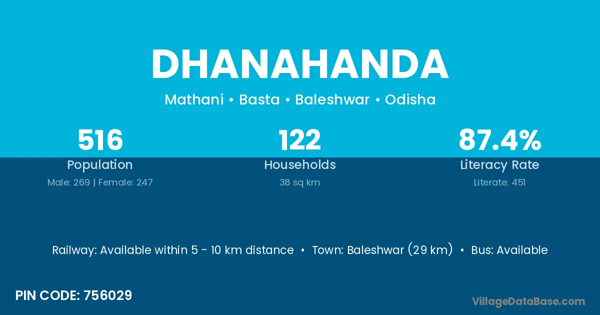 Baleshwar (29 km) is the nearest town to Dhanahanda village for major economic activities and is located approximately 29 km away.