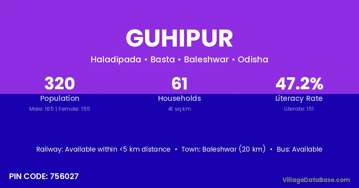 Baleshwar (20 km) is the nearest town to Guhipur village for major economic activities and is located approximately 20 km away.