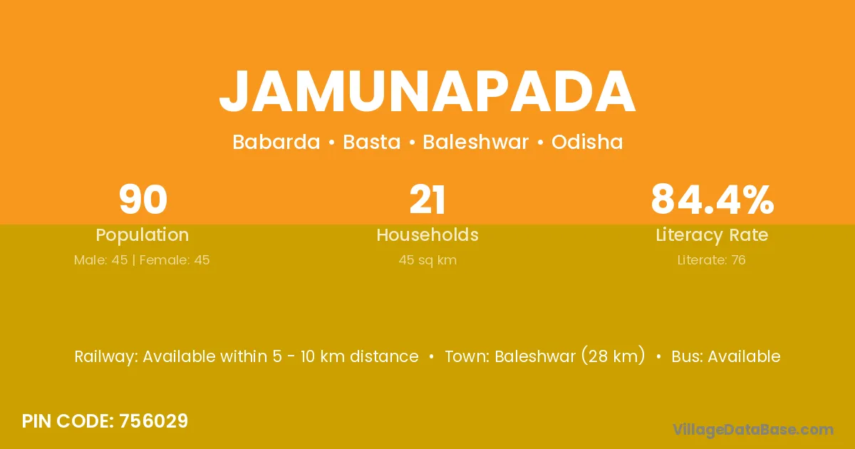 Baleshwar (28 km) is the nearest town to Jamunapada village for major economic activities and is located approximately 28 km away.