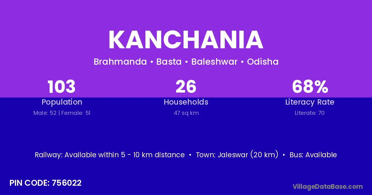 Jaleswar (20 km) is the nearest town to Kanchania village for major economic activities and is located approximately 20 km away.