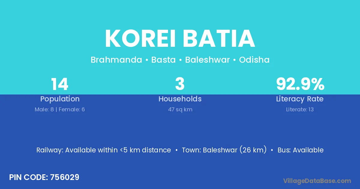 Baleshwar (26 km) is the nearest town to Korei Batia village for major economic activities and is located approximately 26 km away.