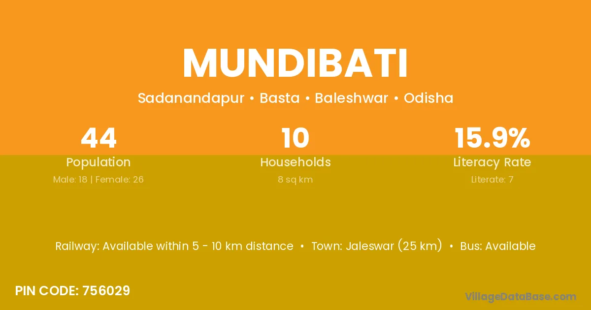 Jaleswar (25 km) is the nearest town to Mundibati village for major economic activities and is located approximately 25 km away.