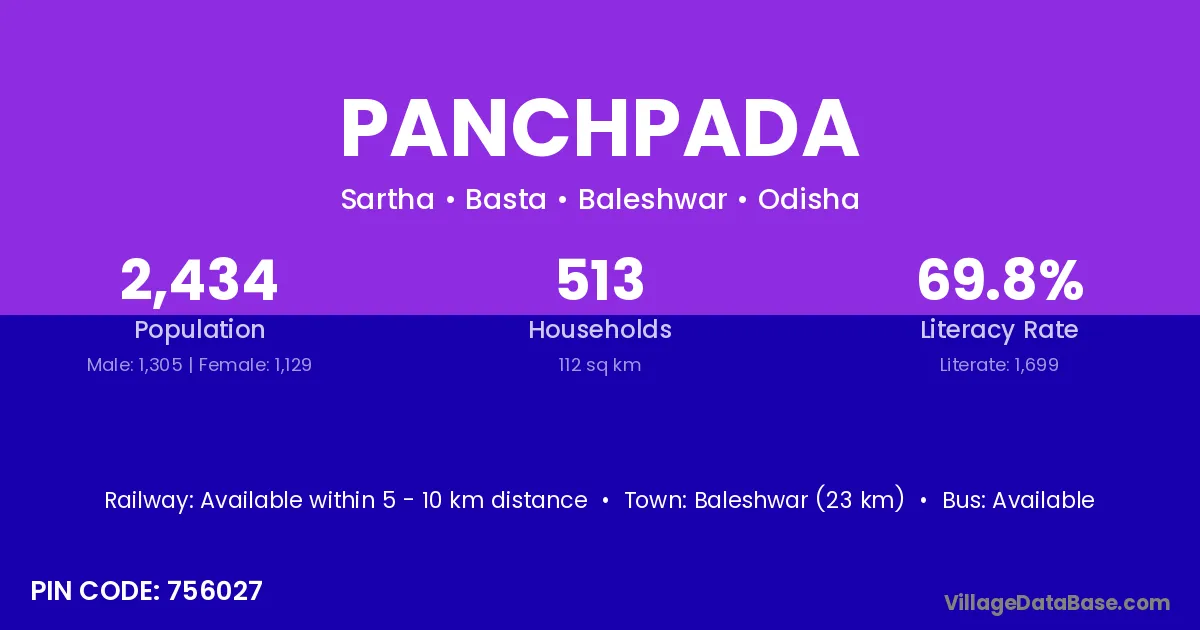 Baleshwar (23 km) is the nearest town to Panchpada village for major economic activities and is located approximately 23 km away.