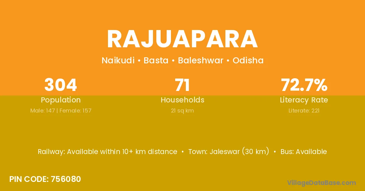 Jaleswar (30 km) is the nearest town to Rajuapara village for major economic activities and is located approximately 30 km away.