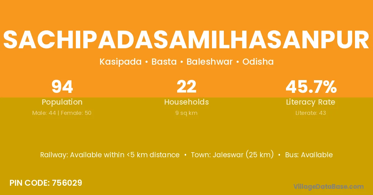 Jaleswar (25 km) is the nearest town to Sachipadasamilhasanpur village for major economic activities and is located approximately 25 km away.