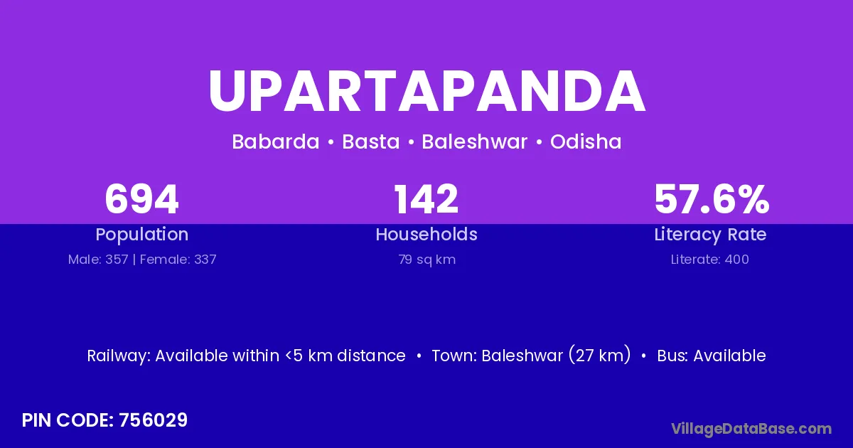 Baleshwar (27 km) is the nearest town to Upartapanda village for major economic activities and is located approximately 27 km away.