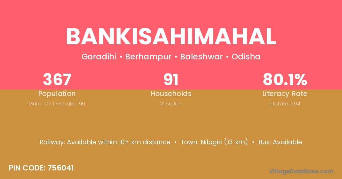 Nilagiri (13 km) is the nearest town to Bankisahimahal village for major economic activities and is located approximately 13 km away.