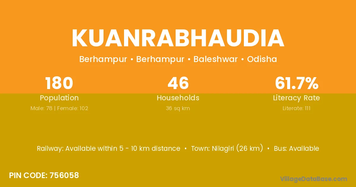Nilagiri (26 km) is the nearest town to Kuanrabhaudia village for major economic activities and is located approximately 26 km away.