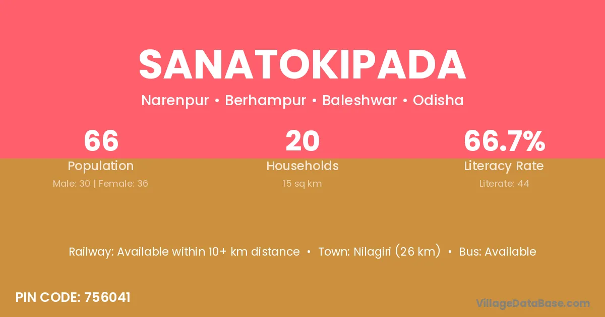 Nilagiri (26 km) is the nearest town to Sanatokipada village for major economic activities and is located approximately 26 km away.