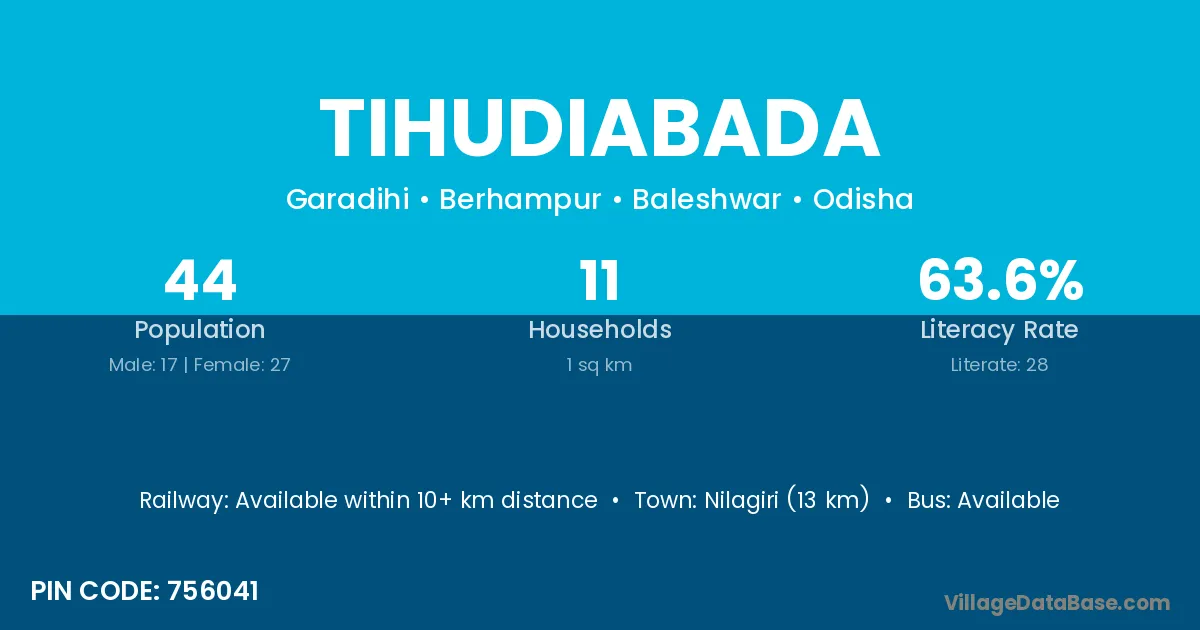 Nilagiri (13 km) is the nearest town to Tihudiabada village for major economic activities and is located approximately 13 km away.