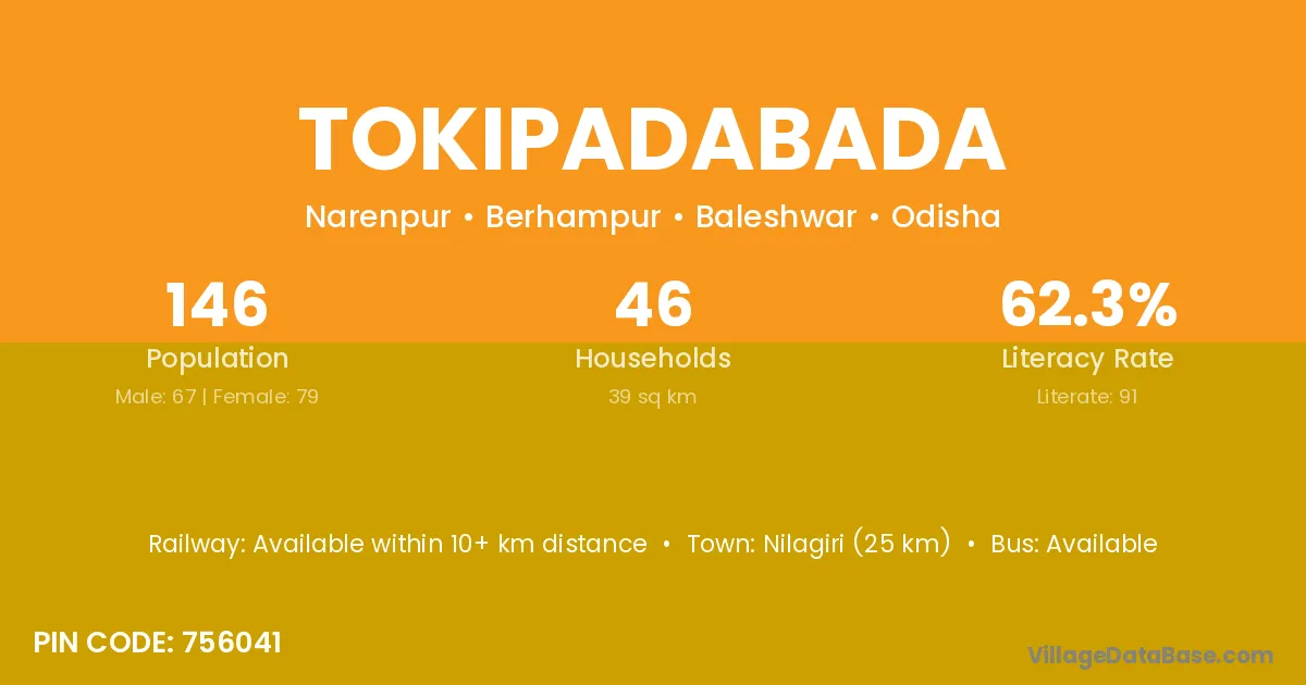 Nilagiri (25 km) is the nearest town to Tokipadabada village for major economic activities and is located approximately 25 km away.
