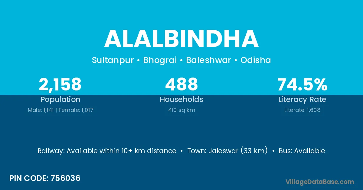 Jaleswar (33 km) is the nearest town to Alalbindha village for major economic activities and is located approximately 33 km away.