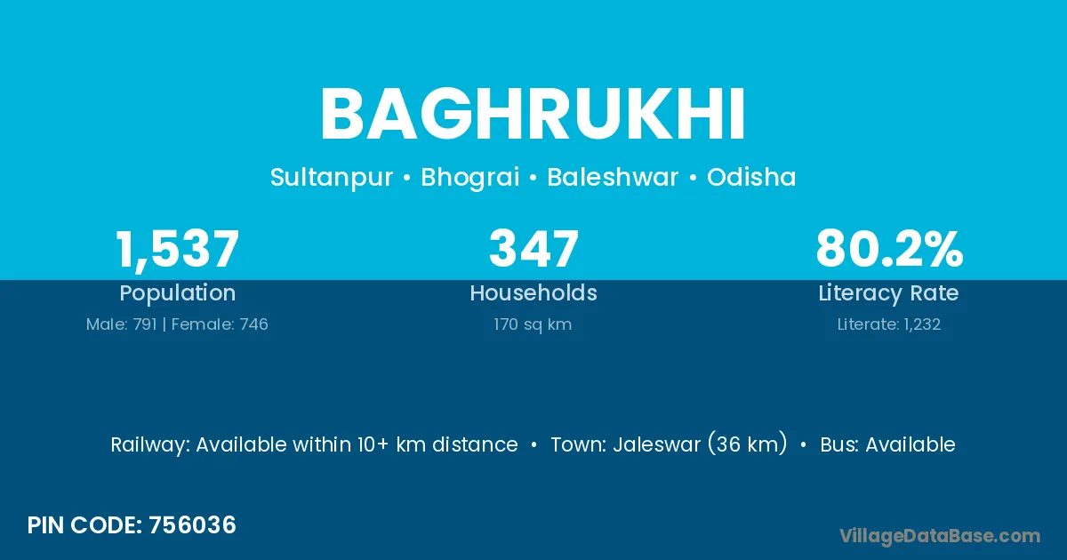 Jaleswar (36 km) is the nearest town to Baghrukhi village for major economic activities and is located approximately 36 km away.