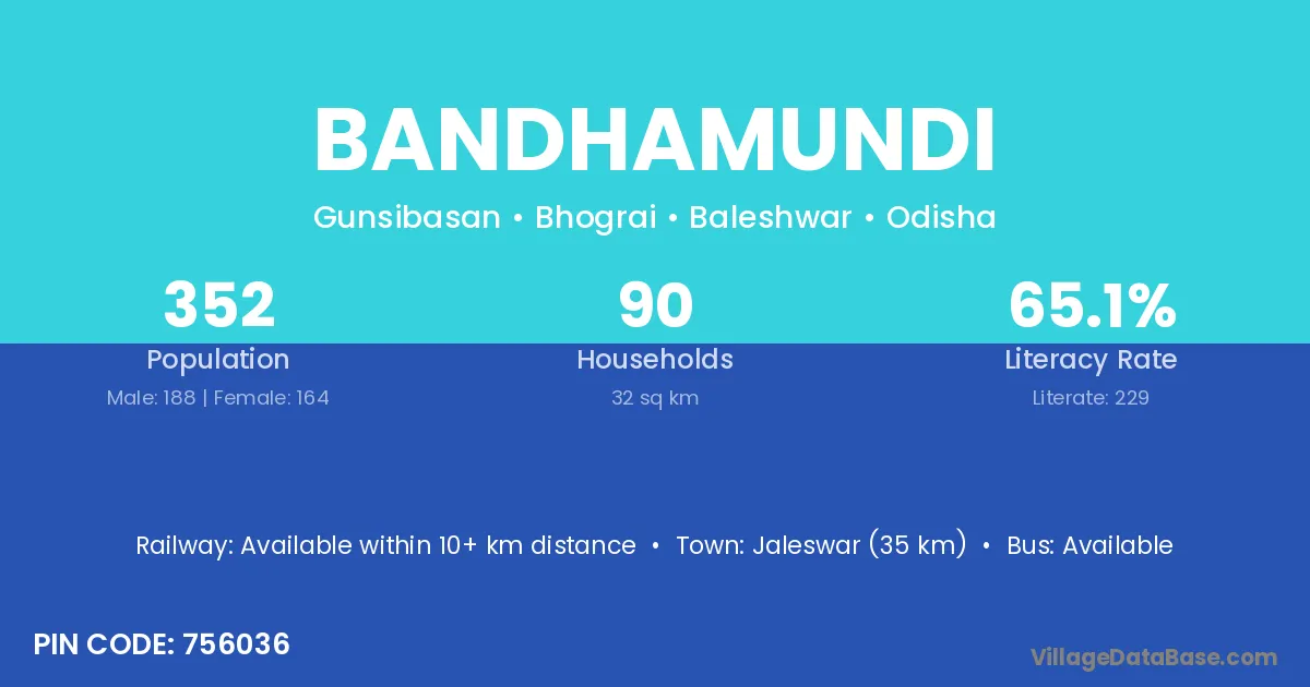 Jaleswar (35 km) is the nearest town to Bandhamundi village for major economic activities and is located approximately 35 km away.