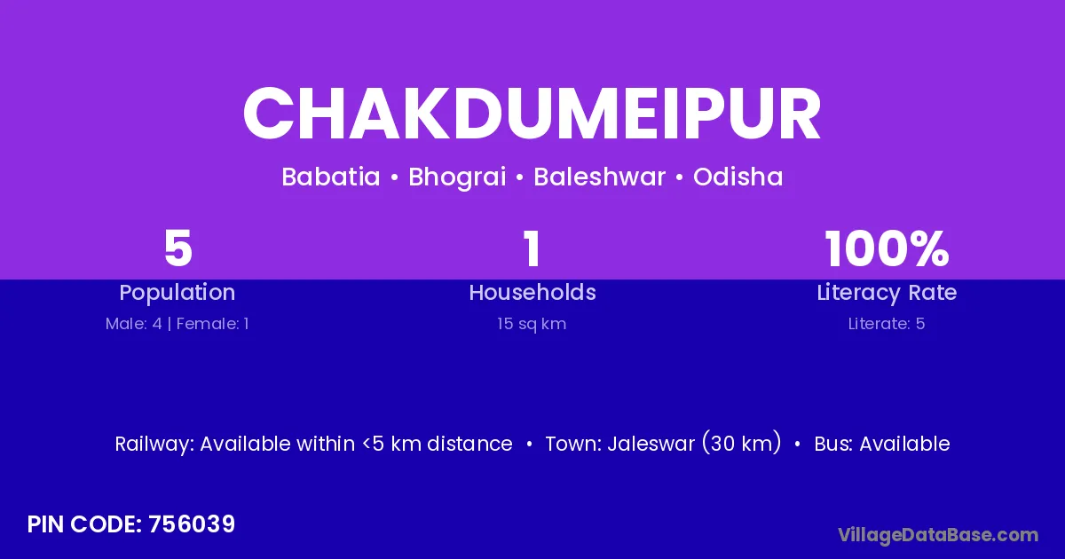 Jaleswar (30 km) is the nearest town to Chakdumeipur village for major economic activities and is located approximately 30 km away.