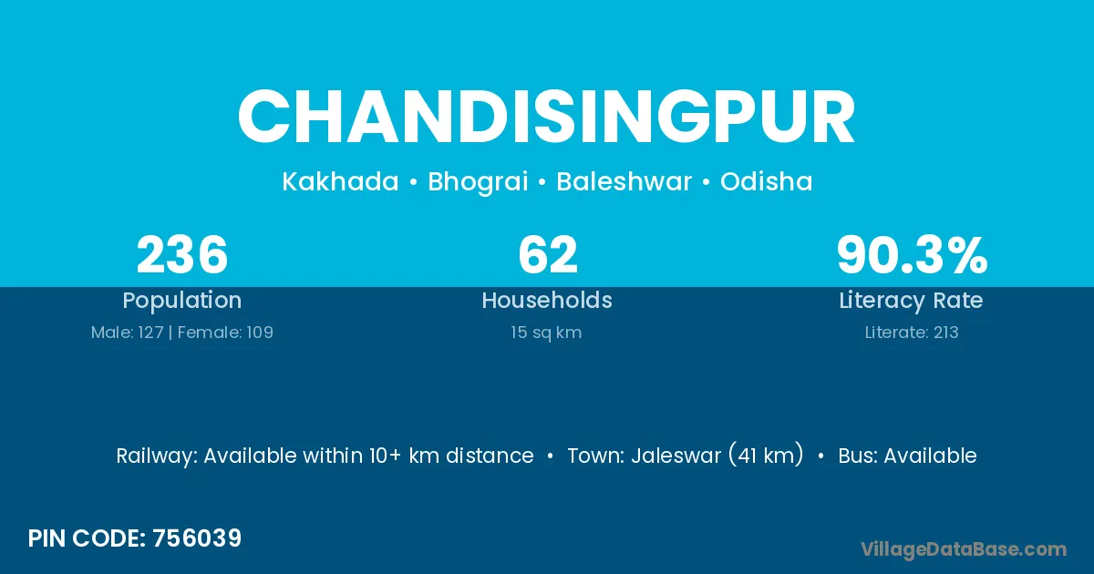 Jaleswar (41 km) is the nearest town to Chandisingpur village for major economic activities and is located approximately 41 km away.