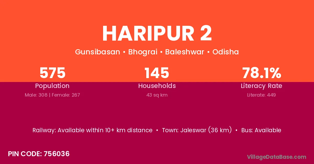 Jaleswar (36 km) is the nearest town to Haripur 2 village for major economic activities and is located approximately 36 km away.