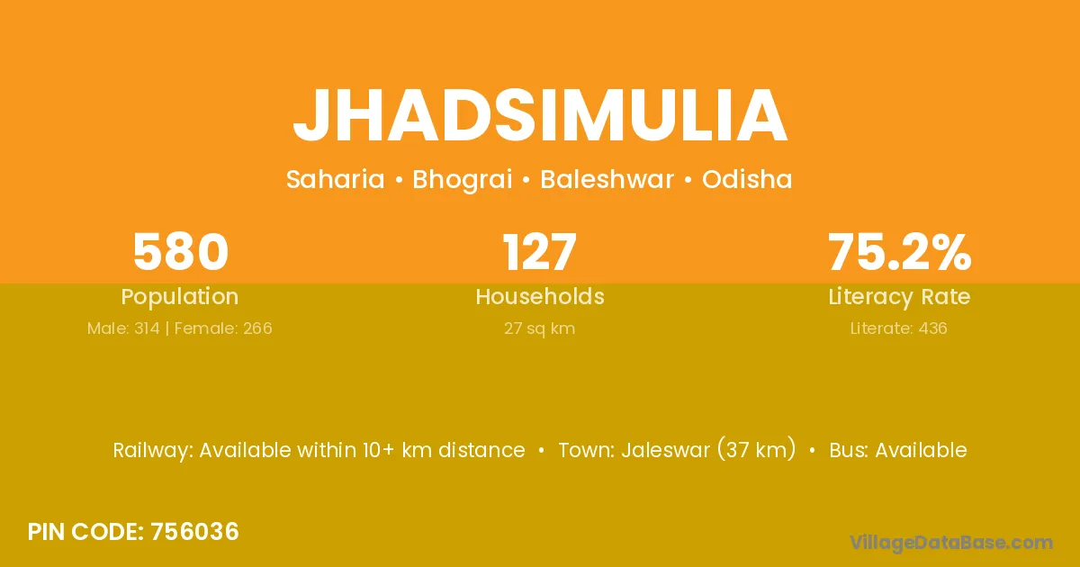 Jaleswar (37 km) is the nearest town to Jhadsimulia village for major economic activities and is located approximately 37 km away.