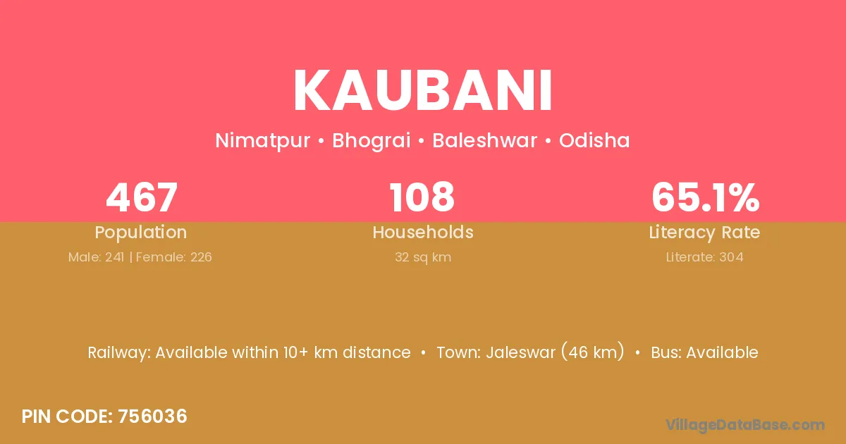 Jaleswar (46 km) is the nearest town to Kaubani village for major economic activities and is located approximately 46 km away.