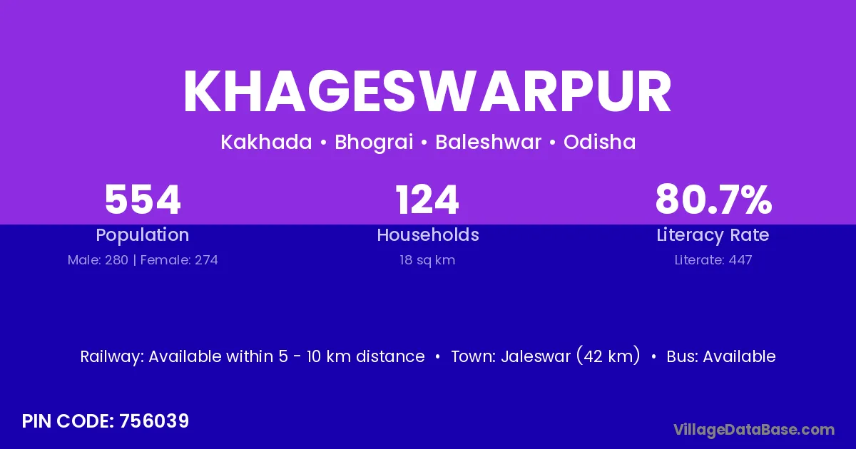 Jaleswar (42 km) is the nearest town to Khageswarpur village for major economic activities and is located approximately 42 km away.