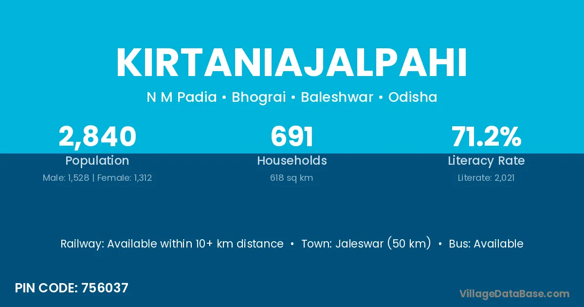 Jaleswar (50 km) is the nearest town to Kirtaniajalpahi village for major economic activities and is located approximately 50 km away.